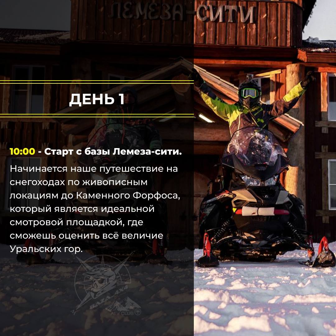 Путешествие на снегоходах по живописным локациям до Каменного Форфоса, который является идеальной смотровой площадкой, где сможешь оценить все величие Уральских гор.